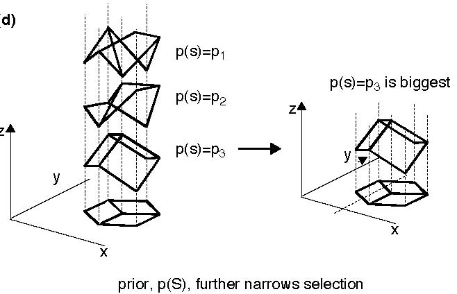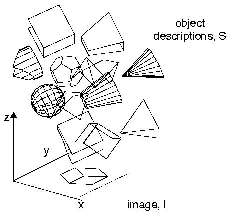 | Must find the probabilities of various conceivable shape interpretations (hypotheses), given the image (data). According to Bayes, $$p(S\mid I) \propto p(I\mid S)p(S)$$ | The likelihood term, \(p(I\mid S)\), rules out shapes \(S\) that are inconsistent with the image \(I\) (here, spheres, cones, etc.). |